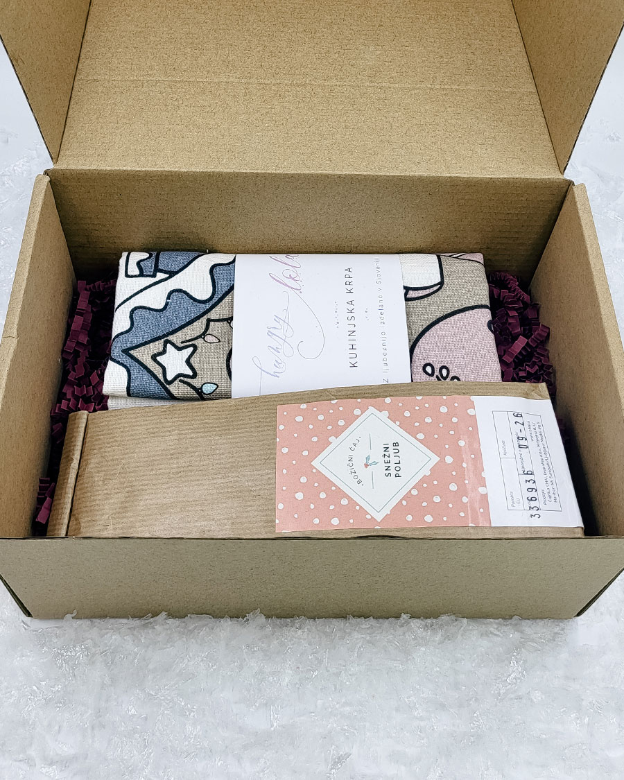 Darilni paket popoln za prihajajoča božična obdarovanja. Sestavljeni so iz slovenskih izdelkov. V paketu sta kuhinjska krpa in sadni božični čaj.