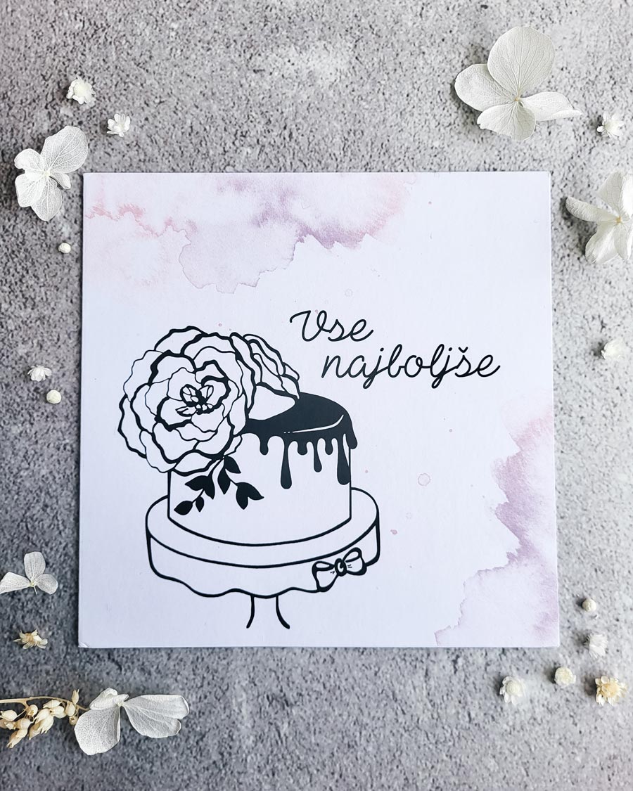 Preprosta in nežna rojstnodnevna voščilnica z unikatno, avtorsko ilustracijo torte. Voščilnici je priložena kuverta.
