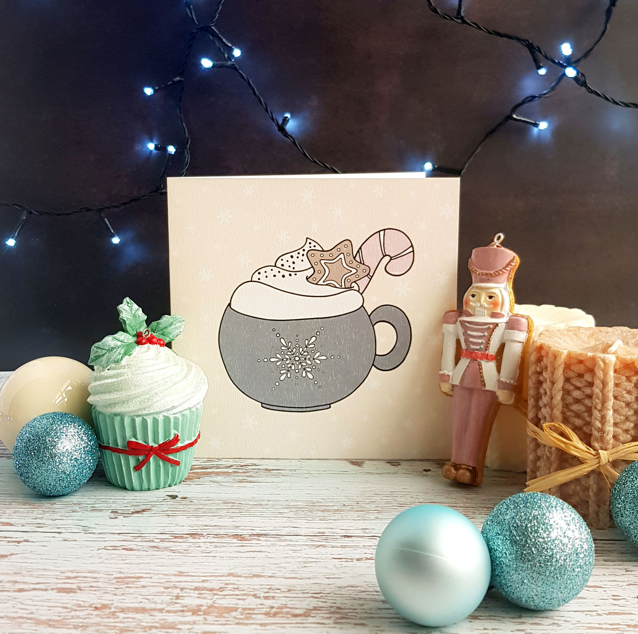 Preprosta in nežna božična voščilnica z unikatno, avtorsko ilustracijo vroče čokolade. Voščilnici je priložena kuverta.
